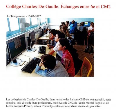 Cette liaison organisée et encadrée par Madame Guillas (professeure des CM2), Madame Petit (professeure de français) et Madame Bidon (documentaliste) porte sur l’analyse de la mise en forme de différentes unes des journaux papiers (Le Figaro, Ouest France, Télégramme, La Croix…).