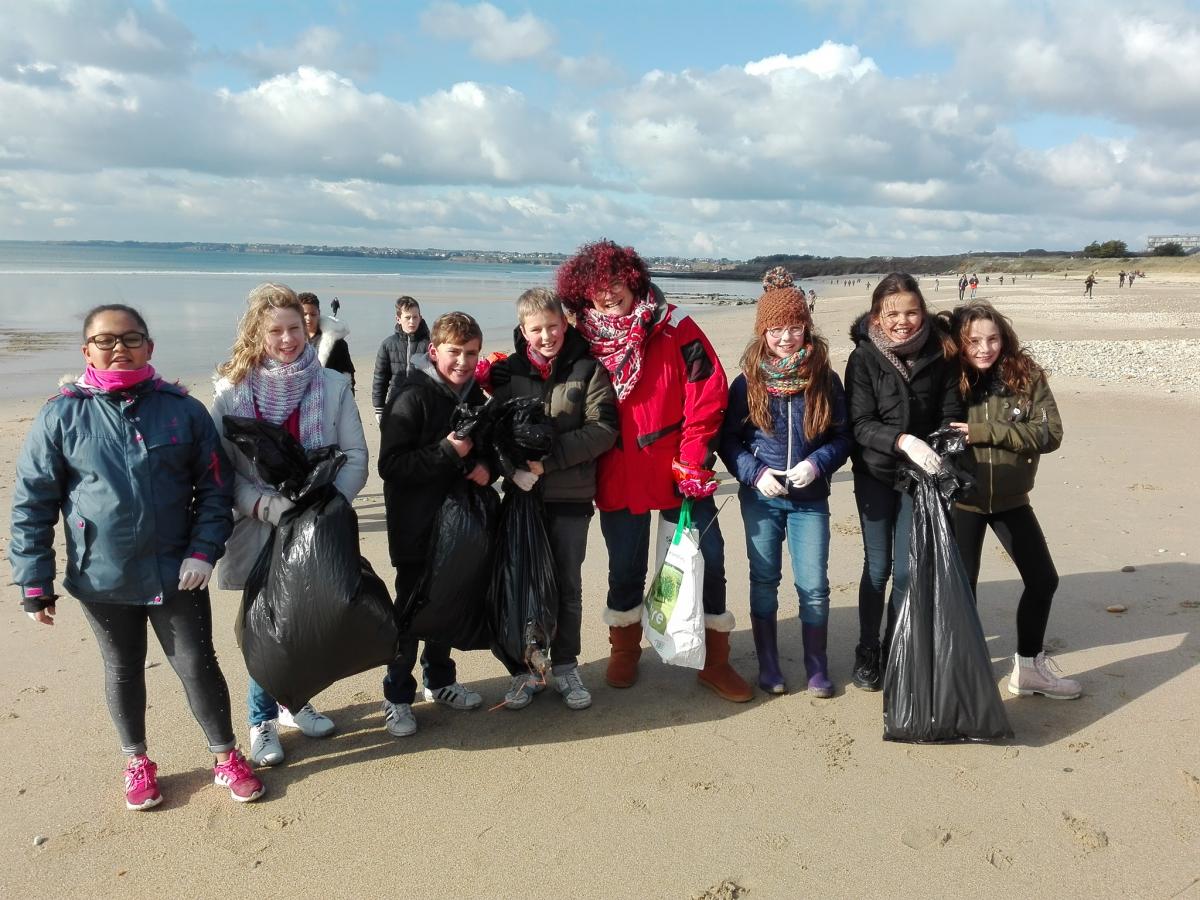 À l’occasion d’un projet concernant l’étude des matériaux en technologie 6e, les 4 classes de Mme SINTES se sont rendues à la plage du Fort-Bloqué de Ploemeur pour ramasser des déchets dans la laisse de mer. Celle-ci regorge habituellement de débris naturels mais la pollution plastique l’envahit peu à peu.