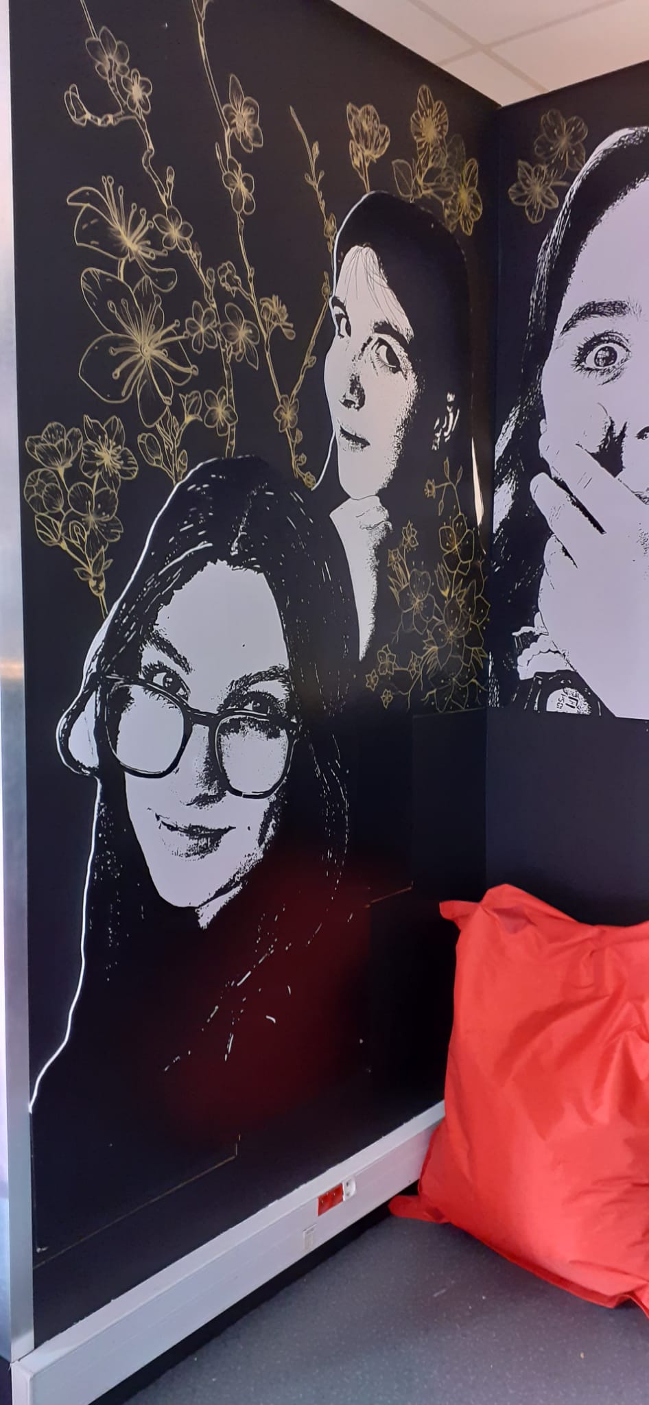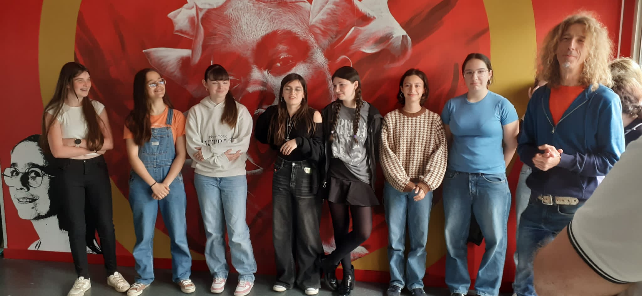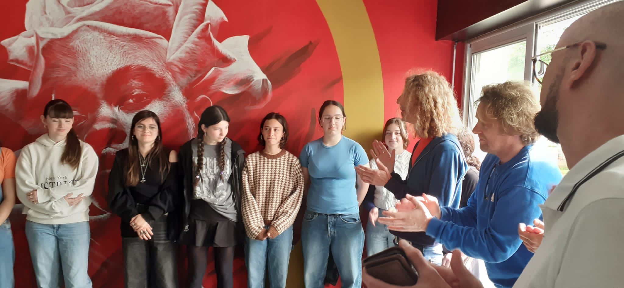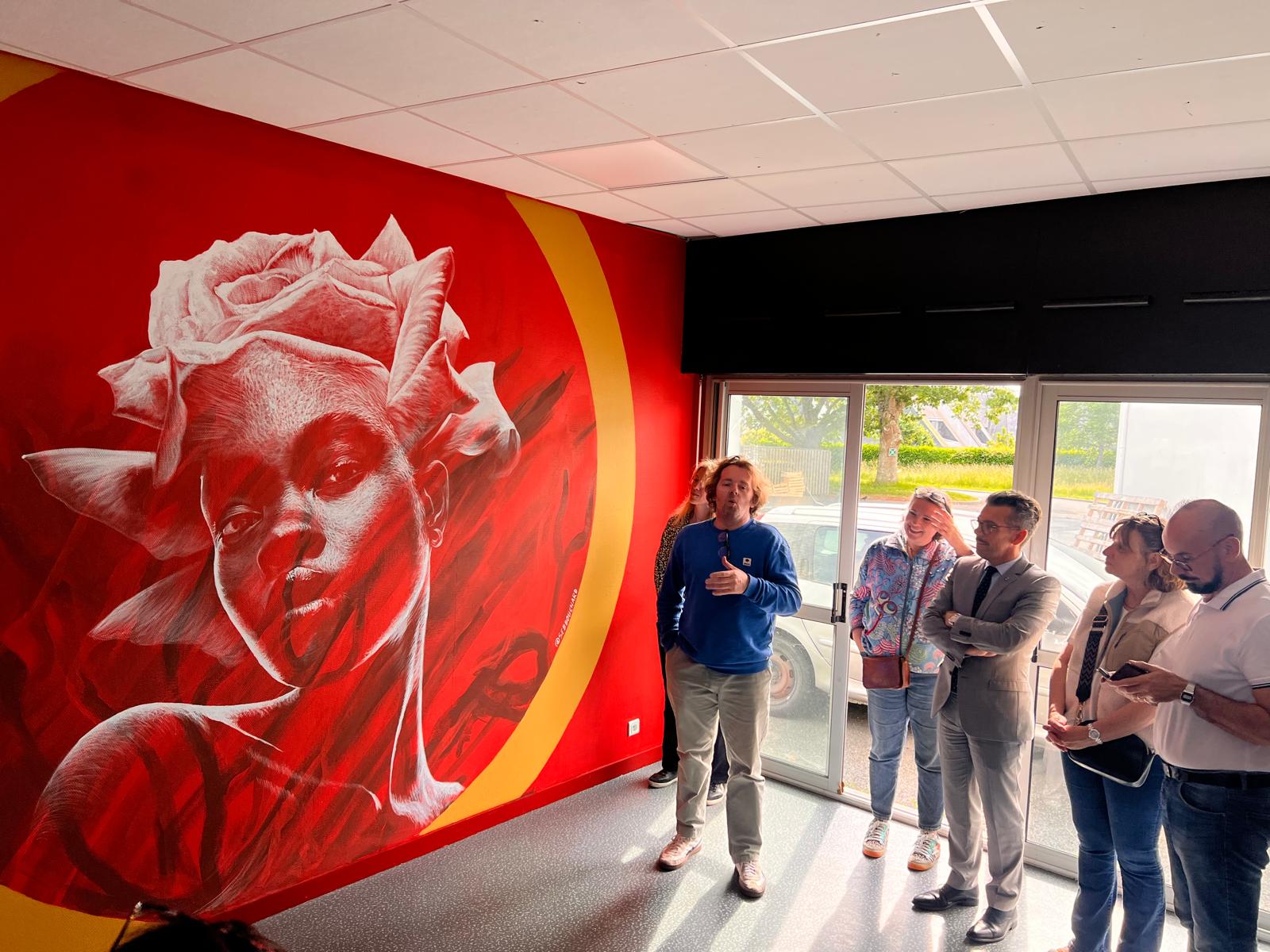 C'est d'ailleurs dans la deuxième salle, celle de projection ciné, toute de rouge, noir et or décorée que le Principal, M. HUET et son ancienne collègue et homologue Mme LEMOYNE ont  reçu le Maire de Ploemeur, Ronan LOAS pour admirer les splendides portraits grands formats des élèves de l'atelier fresque du professeur d'arts plastiques, Jean-Yves GAUTHE, ainsi que celui de Sébastien BOUCHARD, muraliste et portraitiste,  qui collaborait pour la seconde année consécutive.