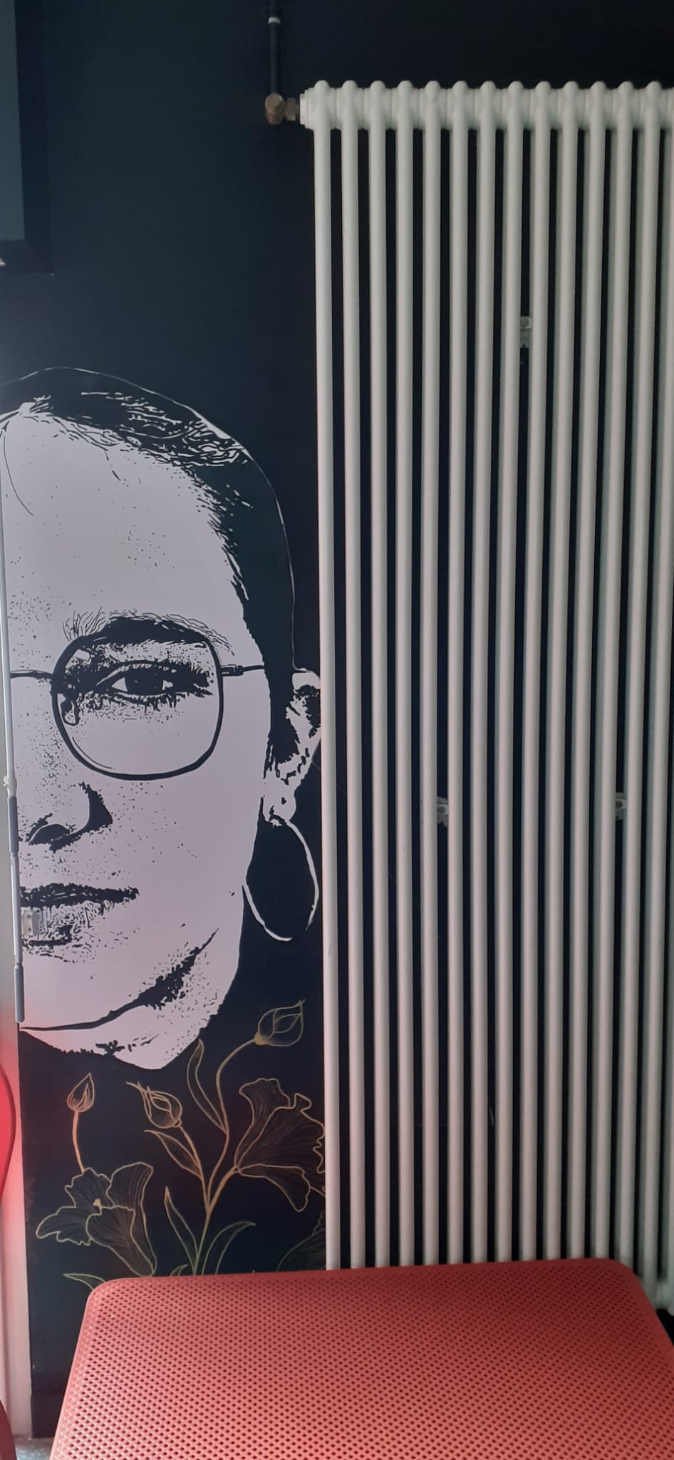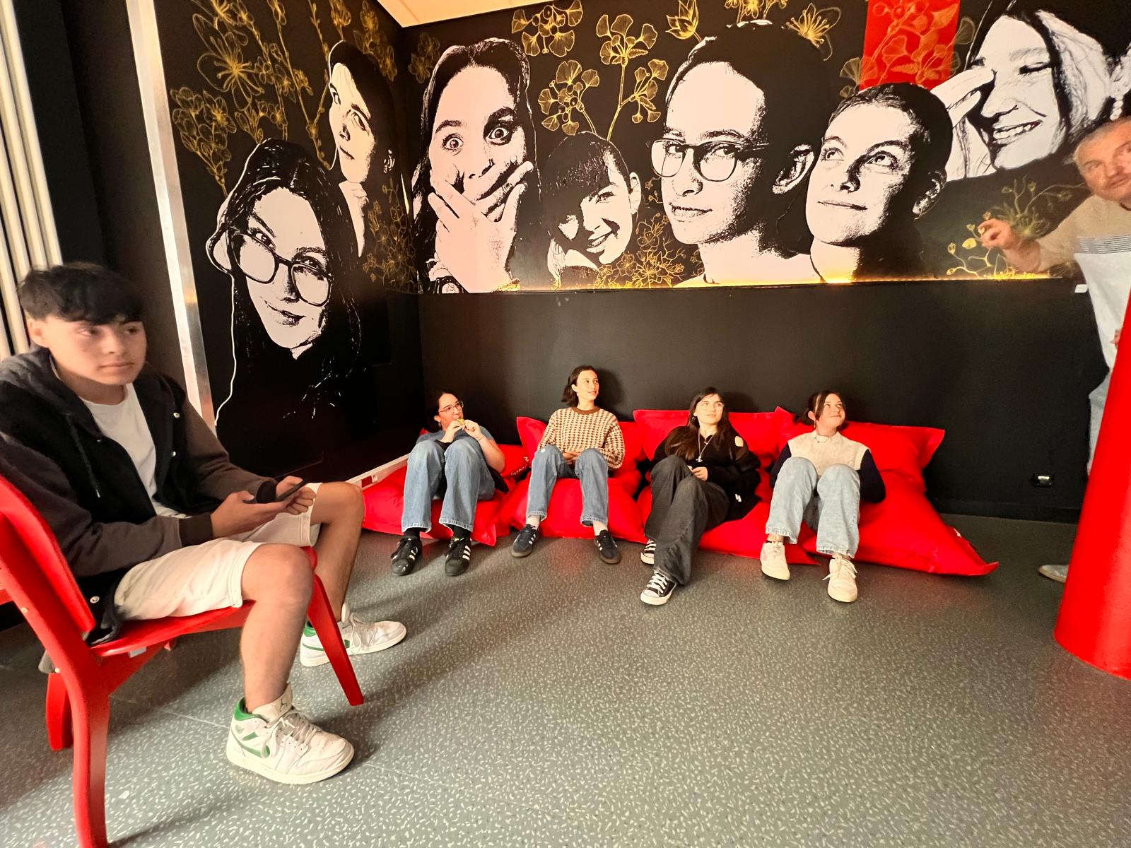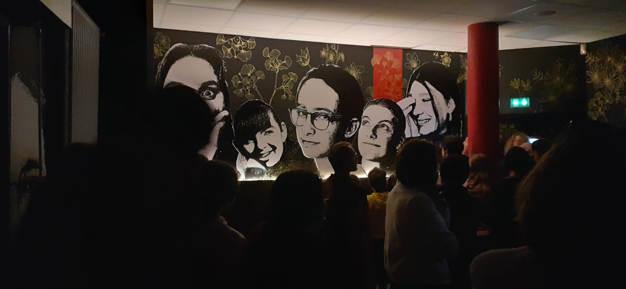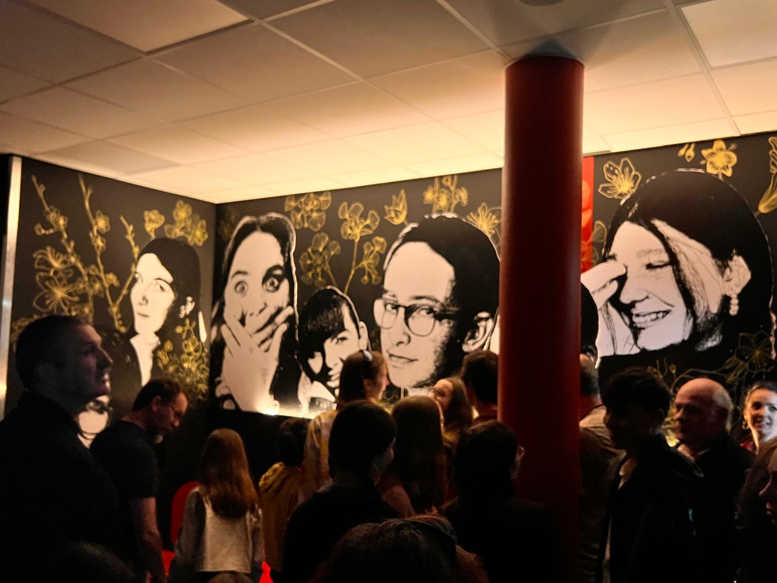 C'est d'ailleurs dans la deuxième salle, celle de projection ciné, toute de rouge, noir et or décorée que le Principal, M. HUET et son ancienne collègue et homologue Mme LEMOYNE ont  reçu le Maire de Ploemeur, Ronan LOAS pour admirer les splendides portraits grands formats des élèves de l'atelier fresque du professeur d'arts plastiques, Jean-Yves GAUTHE, ainsi que celui de Sébastien BOUCHARD, muraliste et portraitiste,  qui collaborait pour la seconde année consécutive.