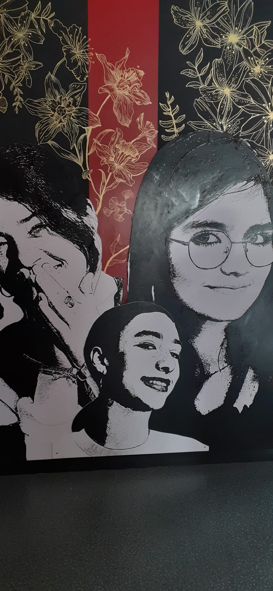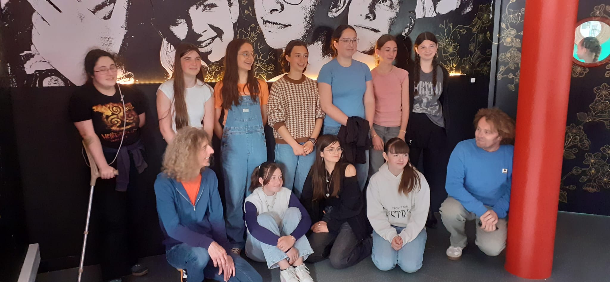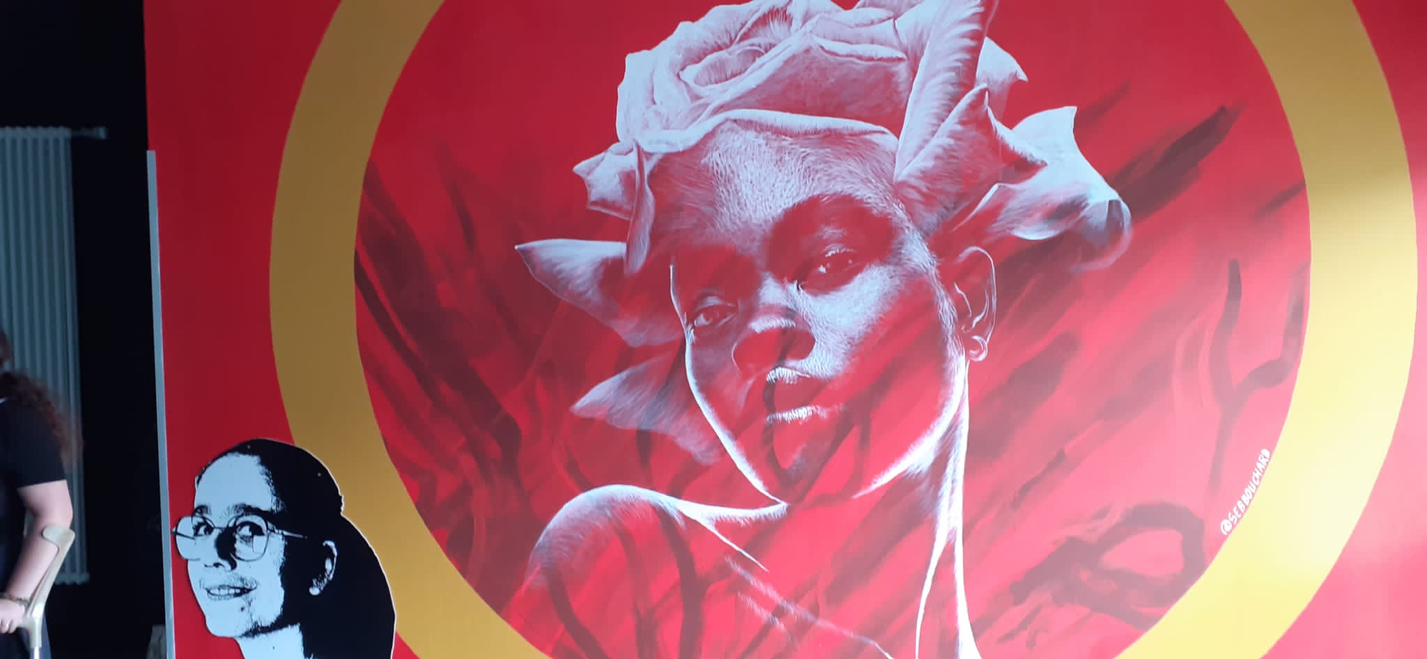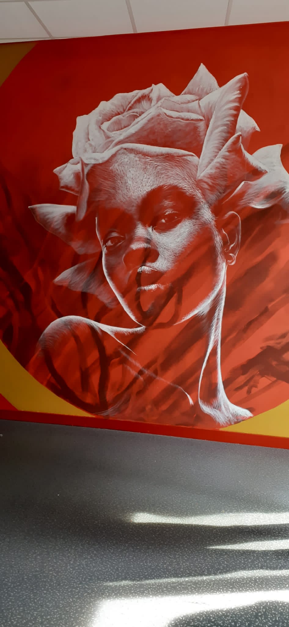 C'est d'ailleurs dans la deuxième salle, celle de projection ciné, toute de rouge, noir et or décorée que le Principal, M. HUET et son ancienne collègue et homologue Mme LEMOYNE ont  reçu le Maire de Ploemeur, Ronan LOAS pour admirer les splendides portraits grands formats des élèves de l'atelier fresque du professeur d'arts plastiques, Jean-Yves GAUTHE, ainsi que celui de Sébastien BOUCHARD, muraliste et portraitiste,  qui collaborait pour la seconde année consécutive.