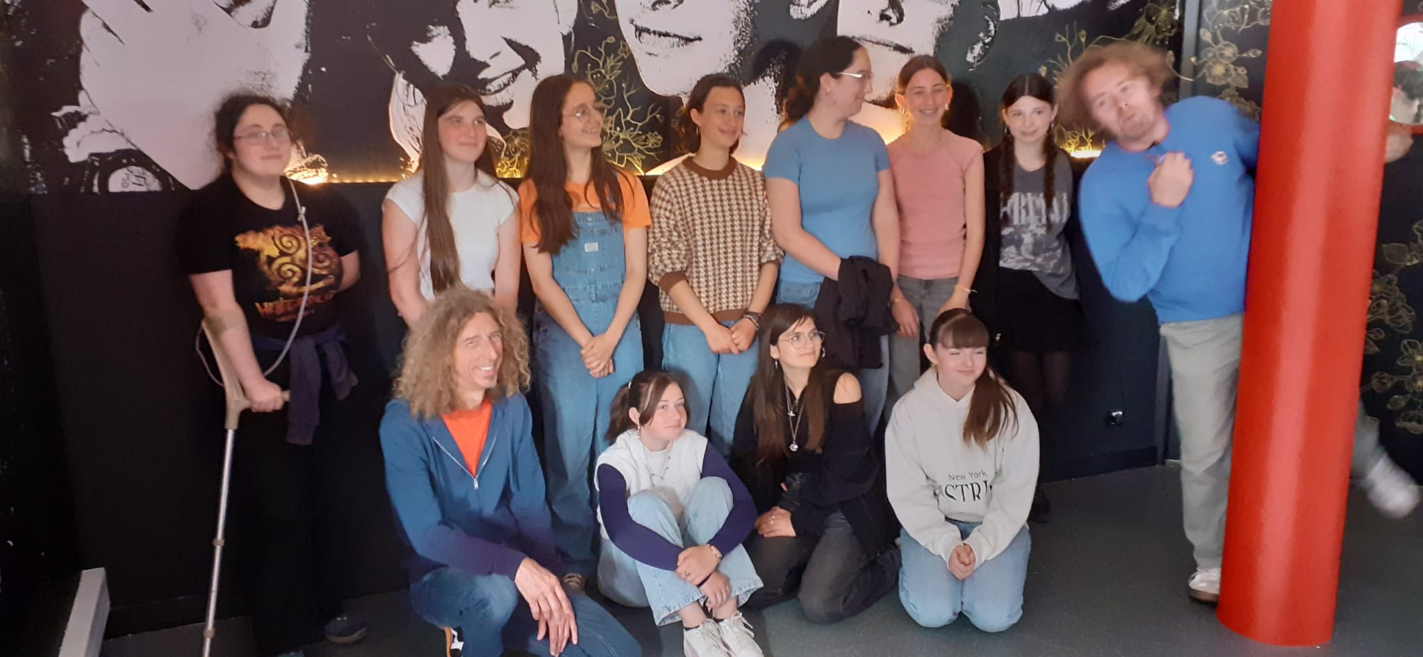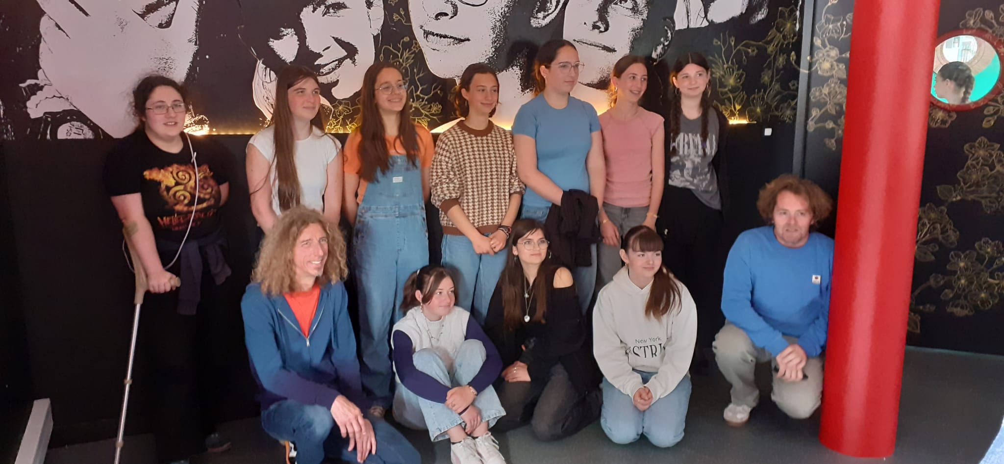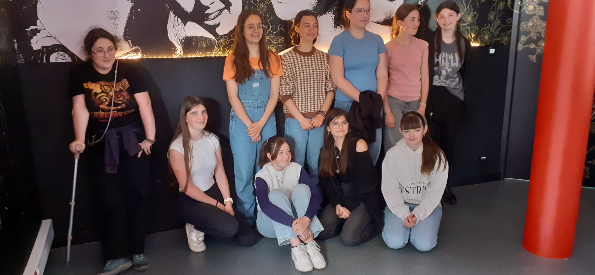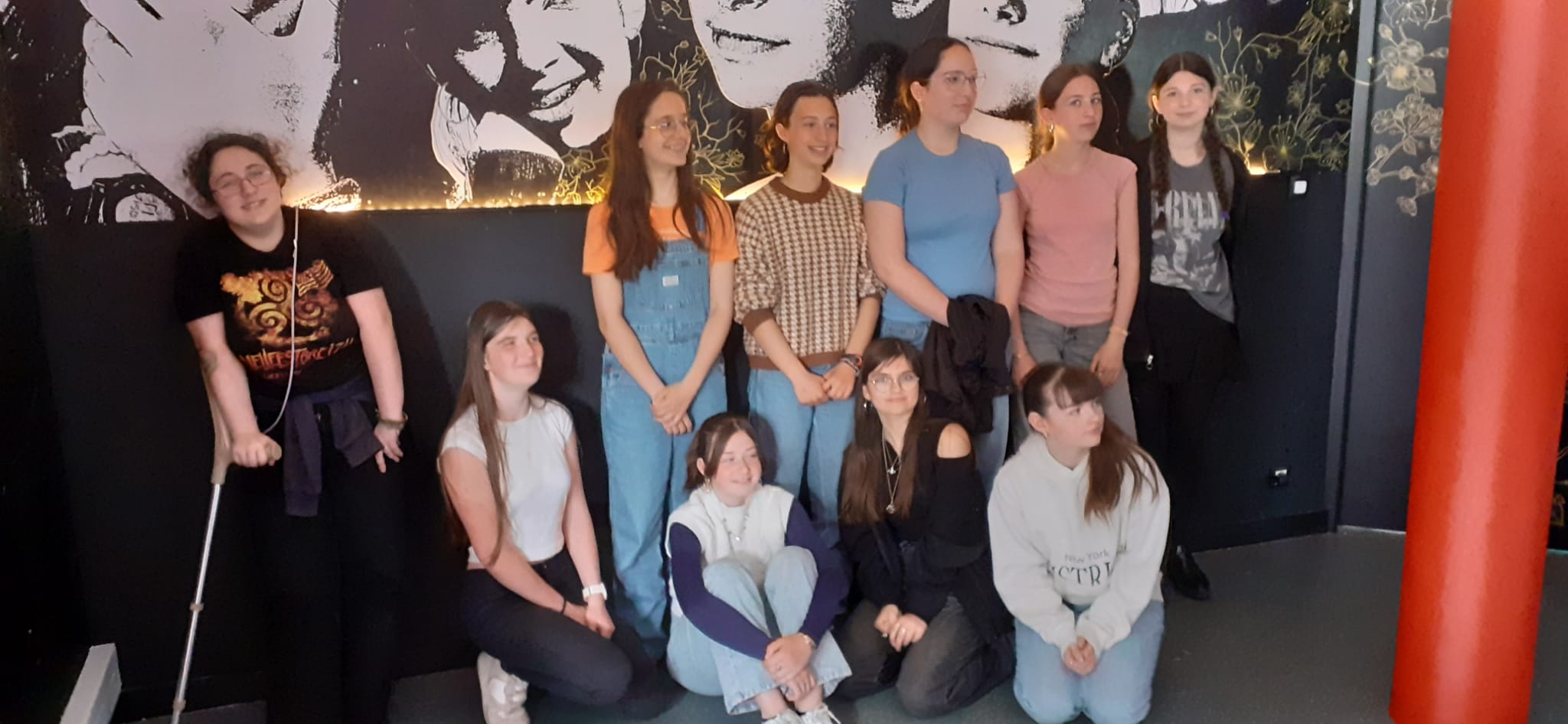 C'est d'ailleurs dans la deuxième salle, celle de projection ciné, toute de rouge, noir et or décorée que le Principal, M. HUET et son ancienne collègue et homologue Mme LEMOYNE ont  reçu le Maire de Ploemeur, Ronan LOAS pour admirer les splendides portraits grands formats des élèves de l'atelier fresque du professeur d'arts plastiques, Jean-Yves GAUTHE, ainsi que celui de Sébastien BOUCHARD, muraliste et portraitiste,  qui collaborait pour la seconde année consécutive.